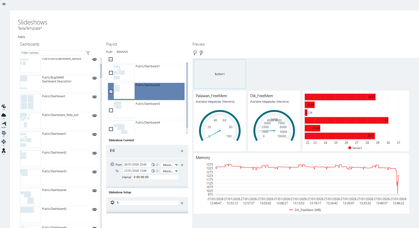 Ideal para Video Walls ou centrais de monitoramento, o modo Slideshow permite criar uma sequência automática de dashboards, exibidos de forma contínua.