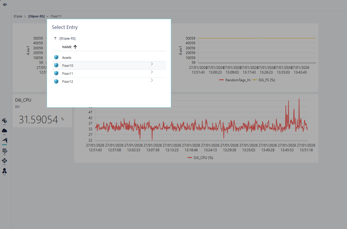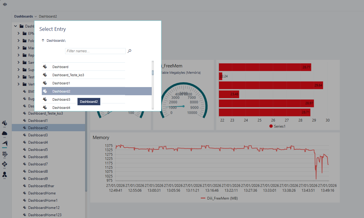 Navegação dinâmica: o usuário percorre a hierarquia de objetos modelados (por exemplo, Fábrica > Setor > Máquina). Ao selecionar uma instância associada a um dashboard, a visualização é carregada automaticamente.