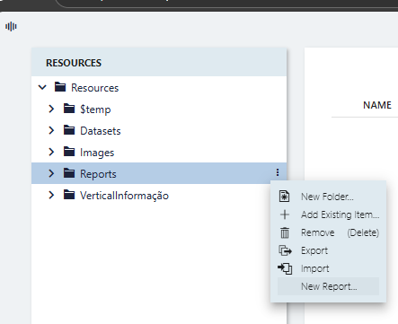 • Acesso: clique na opção de adicionar um novo recurso e selecione Report.